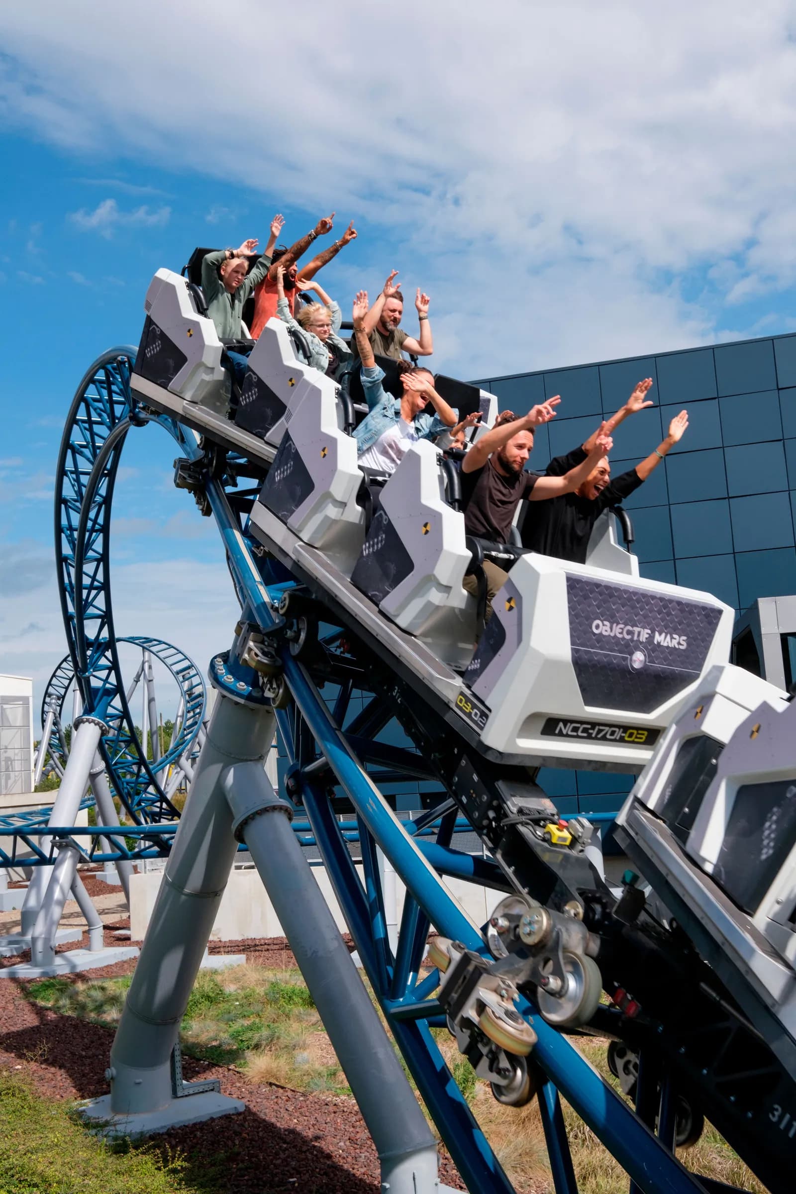 Containing both indoor and outdoor sections this ride is based on a mission to Mars. After a fire on one of the trains in 2023, the ride no longer operates with the spinning function.